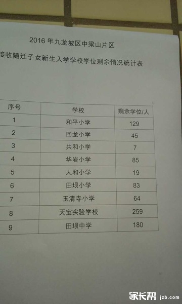 重庆九龙坡区中梁山片区2016年小升初学位剩余情况统计如下表,供参考。